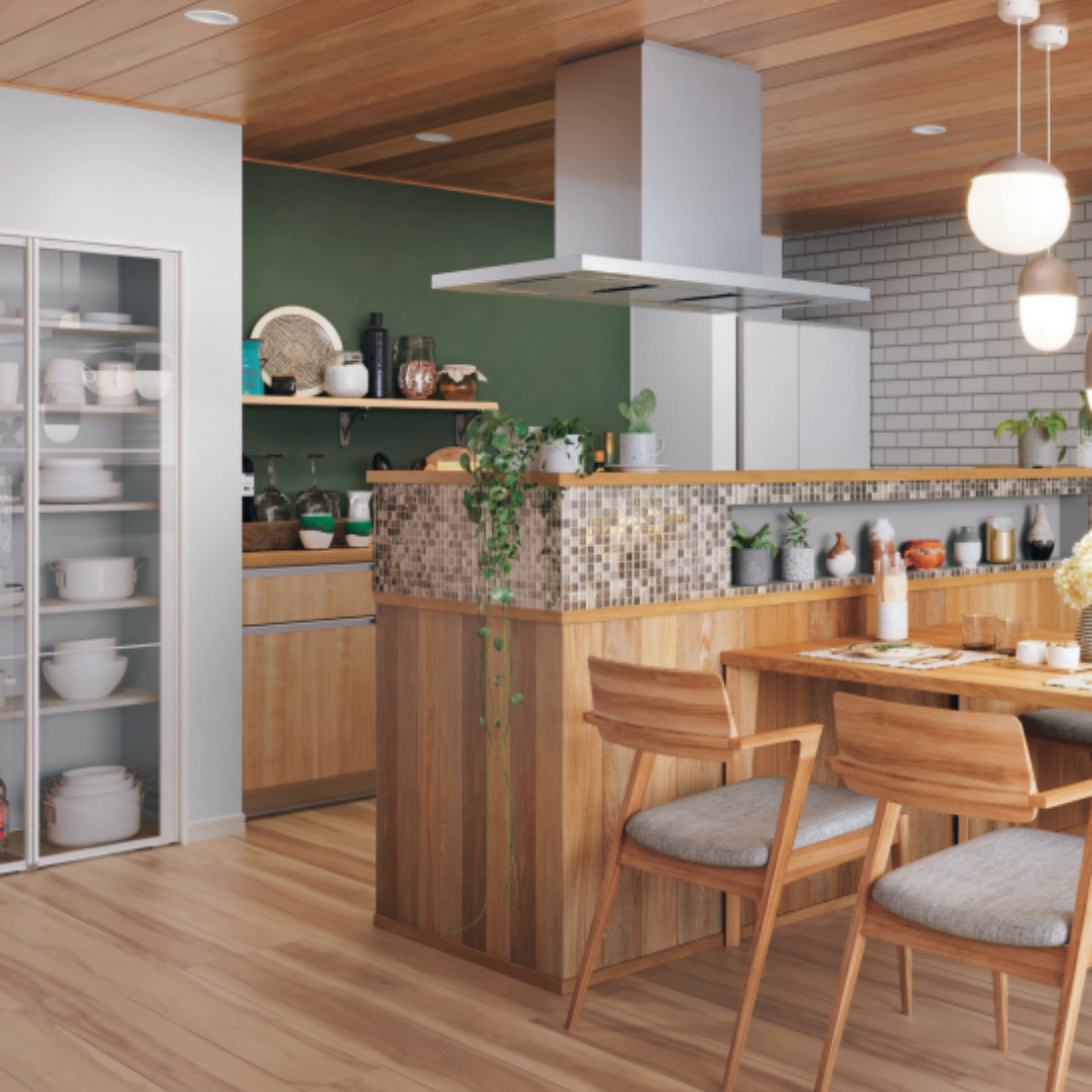 キッチンや家具は木目調にこだわり、統一感を。